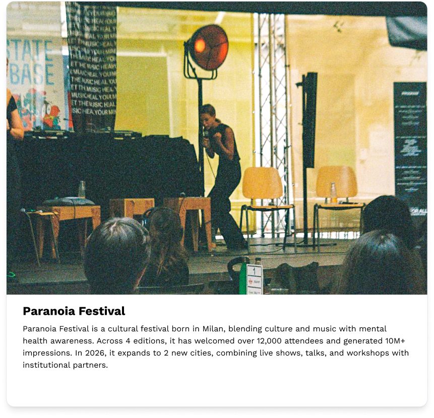 Progettiamo e realizziamo eventi su misura: festival musicali, talk culturali, panel tematici e attivazioni brand. Dalla concezione alla produzione, ogni dettaglio è curato per creare esperienze memorabili che generano engagement autentico e impatto culturale.
