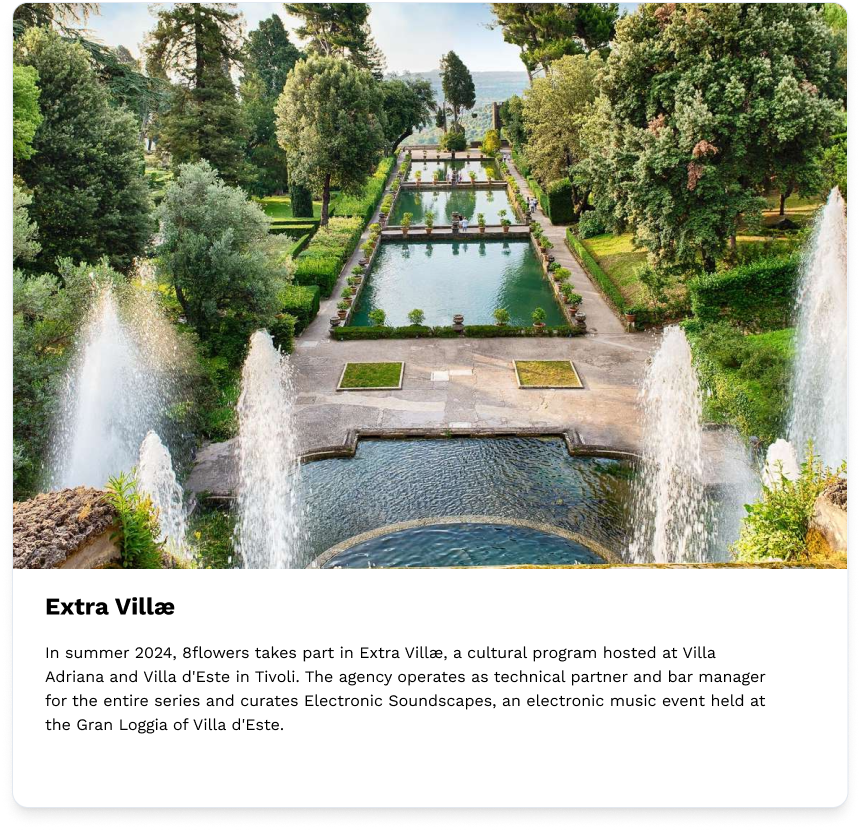 At 8FLOWERS, we believe in the transformative power of culture and creativity. Every project we create begins with listening, develops through innovation, and flourishes through collaboration. We build spaces for dialogue where music, art, and wellbeing come together to generate authentic and memorable experiences.
